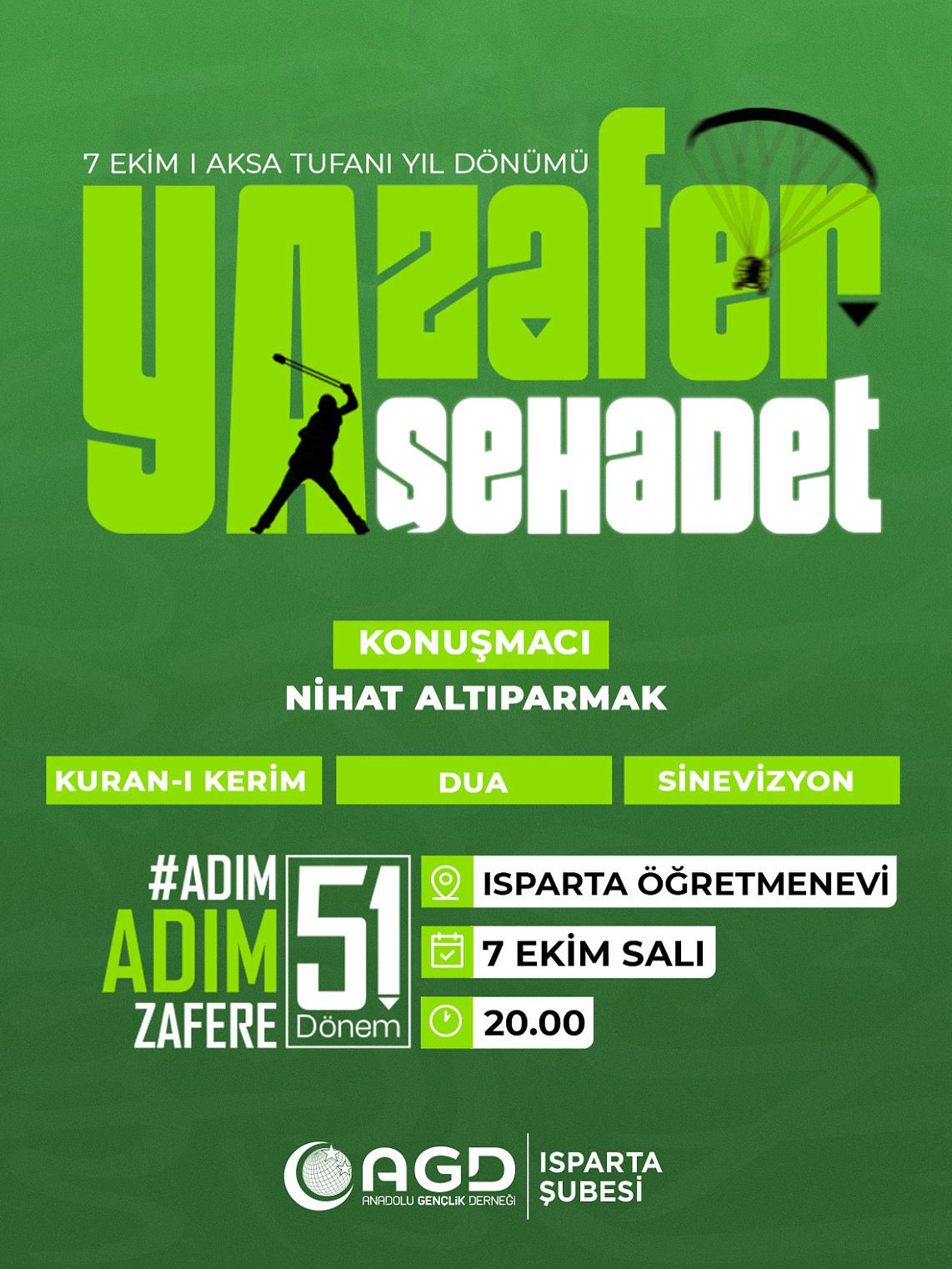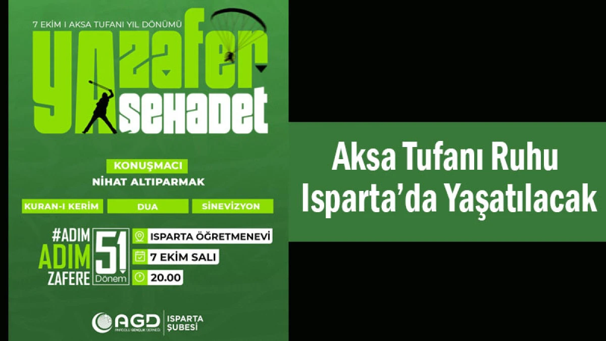 Anadolu Gençlik Derneği (AGD) Isparta Şubesi, 7 Ekim Aksa Tufanı yıl dönümü dolayısıyla “Zafer Şehadet” temalı bir program düzenliyor. Etkinlik, 7 Ekim Salı günü saat 20.00’de Isparta Öğretmenevi’nde gerçekleştirilecek.