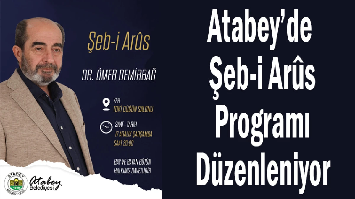 Atabey Belediyesi tarafından düzenlenen Şeb-i Arûs programı, Dr. Ömer Demirbağ’ın katılımıyla gerçekleştirilecek. Manevi atmosferiyle dikkat çeken program, 17 Aralık Çarşamba günü saat 20.00’de Atabey TOKİ Düğün Salonu’nda yapılacak.