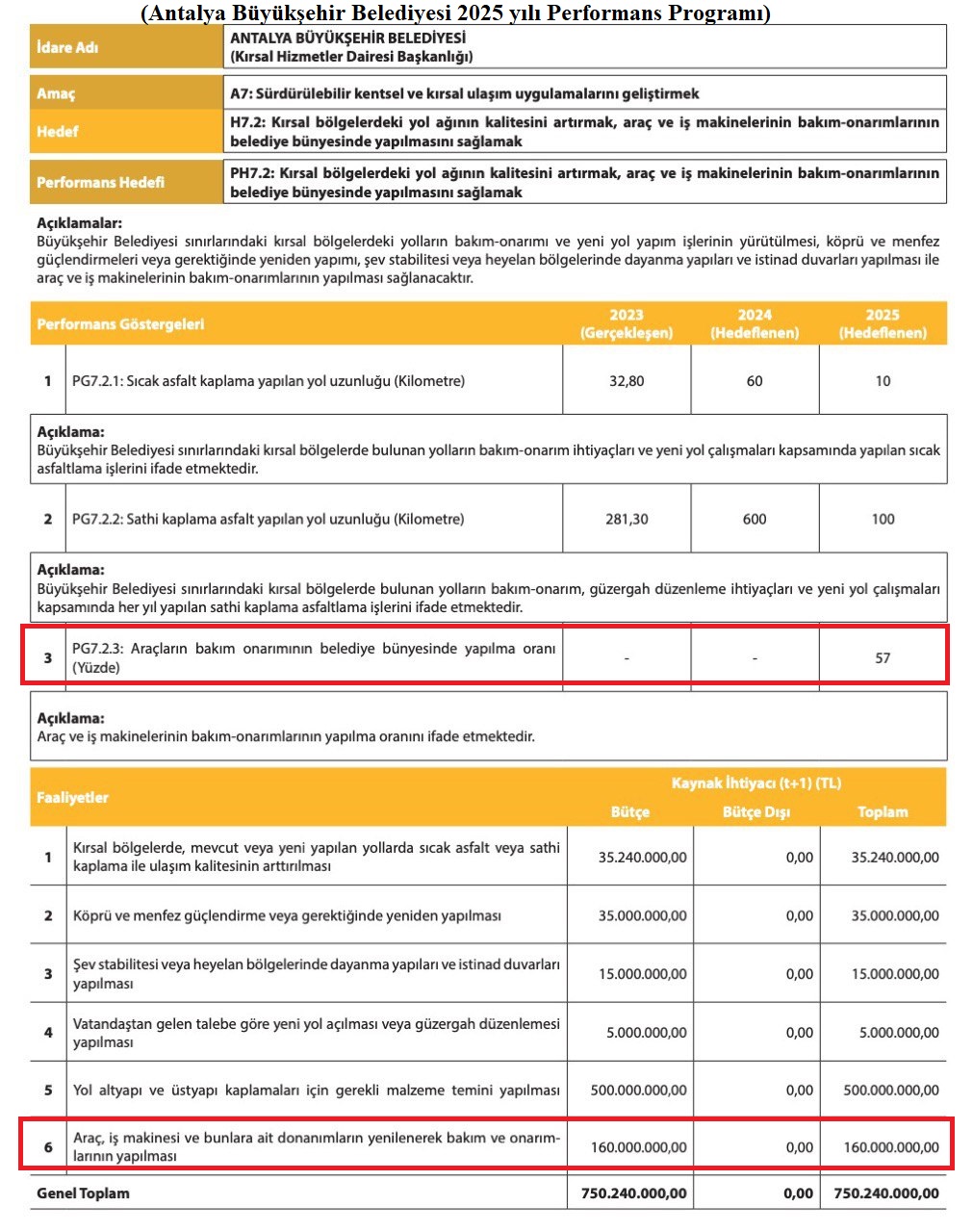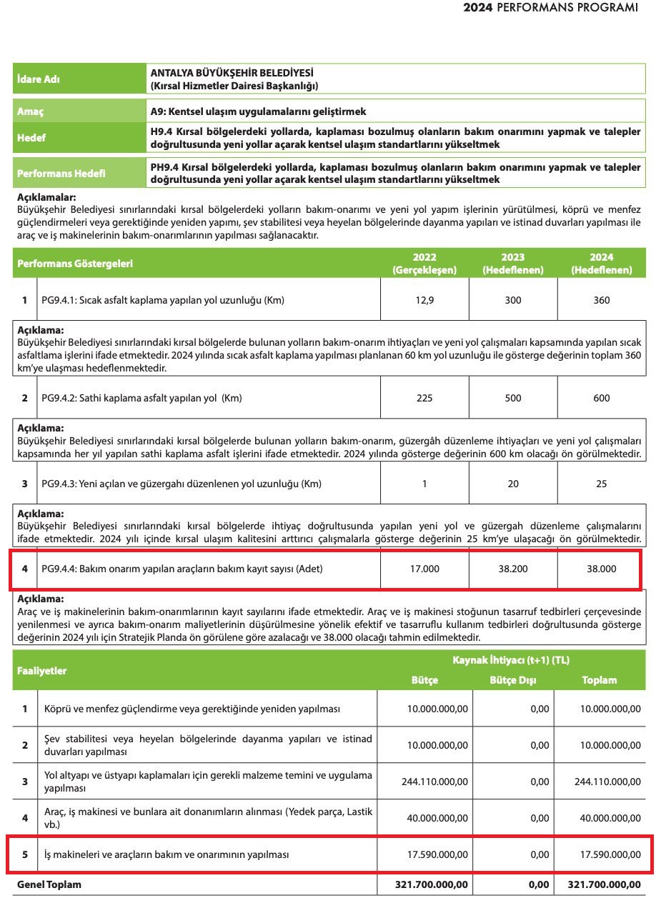 Antalya Büyükşehir Belediyesi’nin 2023 yılı Performans Programı Raporu’nda yer alan erişime açık verilere göre yıl içinde 38.200, 2024 yılı için ise 38 bin araç ve iş makinesi bakım onarımı işlemi yapılması hedefi konulduğu görülüyor. Bu işlemler için harcanması planlanan tahmini bütçe ise 17 milyon 590 bin TL (2024) olarak belirlenmiş. Büyükşehir Belediyesi’nin 2025 yılı Performans Raporu’na bakıldığında ise 2023 ve 2024 yılı için hedeflenen araç ve iş makinesi bakım ve onarım hedefinin gerçekleşme oranının sıfır (0) olduğu görülüyor. Büyükşehir Belediyesi 2025 yılı için de araç bakım ve onarımı için sadece 57 işlem yapılacağını ve bu işlemler için 160 milyon TL harcanabileceğini öngörmüş. Bir önceki yıl 38 bin düzeyinde olan işlem hedefi neredeyse sıfıra inmiş.