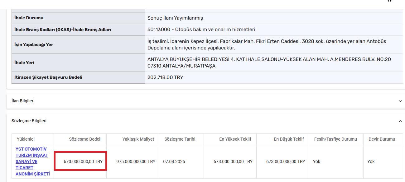Kurum bünyesinde bulunan ve Kırsal Hizmetler Dairesi Başkanlığı’na bağlı olarak hizmet veren Makine İkmal, Bakım ve Onarım Şube Müdürlüğü 2 yıl boyunca hiçbir işlem yapmazken, aynı dönemde belediyenin otobüs bakım onarımı için Yusuf Yadoğlu’nun şirketine yüzlerce milyon liralık ihale verdiği görülüyor. Elektronik Kamu Alımları Platformu (EKAP)’ta yer alan erişime açık verilere göre, Antalya Büyükşehir Belediyesi iş insanı Yusuf Yadoğlu’na ait YST Otomotiv Tur. İnş. San. AŞ’ne 2024 ve 2025 yıllarında toplam 1 milyar 255 milyon 560 bin TL tutarında otobüs bakım ve onarımı ihalesi verdiği görülüyor.