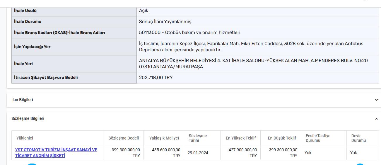 Ancak Yadoğlu’nun şirketlerine verilen ‘otobüs bakım onarım’ ihaleleri bununla da sınırlı değil. Yusuf Yadoğlu’na ait bir başka şirketi olan Beydağ Temizlik, 2 Ocak 2024 tarihli sözleşmeye göre Antalya Büyükşehir Belediyesi’nden 47 milyon 550 bin TL’lik ‘bakım onarım’ ihalesi almış. Yine Yadoğlu’na ait Hanzade Kurumsal şirketinin otobüs bakım ve onarımı işi için 10 Ağustos 2023 tarihinde aldığı ihalenin tutarı 99 milyon TL.