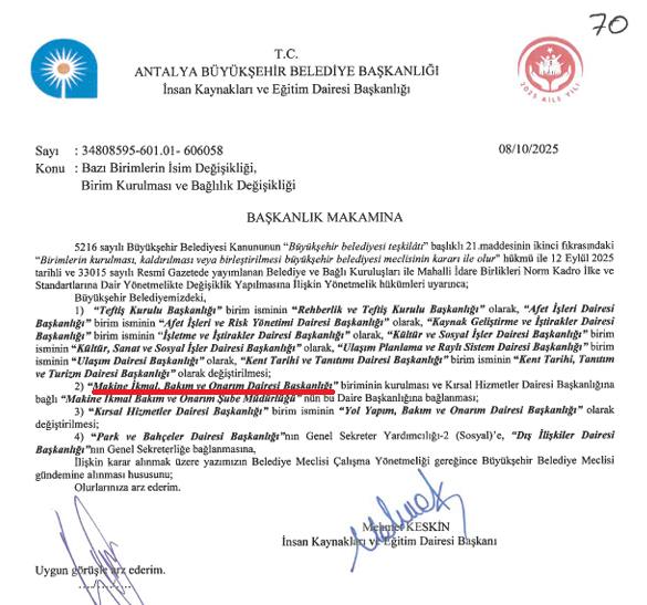 Antalya Büyükşehir Belediyesi’ne yönelik denetimler ve yargı süreçlerinin ardından makine ve araç bakımı konusunda yeni bir daire başkanlığı kurulması, mevcuttaki şube müdürlüğünün de bu daire başkanlığına bağlanması için adım atılmıştı. 13 Ekim 2025 (Bugün) toplanan Antalya Büyükşehir Belediye Meclisi’nin gündemine sunulan teklifte, bazı birimlerinin adının değiştirilmesi ve yeni birim kurulması önerileri yer alıyor. Meclis gündeminin 70. Maddesinde yer alan teklifin bugün yapılacak oturumda oylanması ya da ilgili komisyona havale edilerek 17 Ekim Cuma günü yapılacak oturumda görüşülmesi bekleniyor.