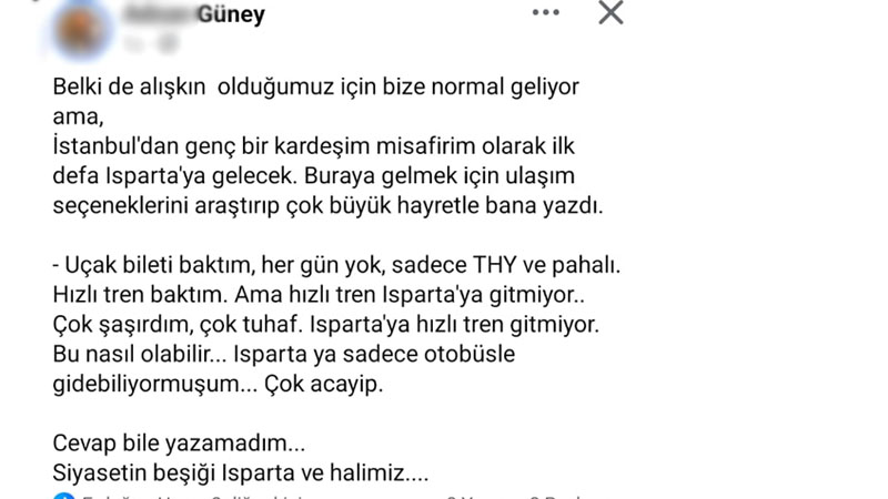 Paylaşımda şu ifadeler yer aldı: “Uçak bileti baktım, her gün yok, sadece THY ve pahalı. Hızlı tren baktım ama hızlı tren Isparta’ya gitmiyor. Çok şaşırdım. Isparta’ya sadece otobüsle gidilebiliyormuş. Çok acayip.”