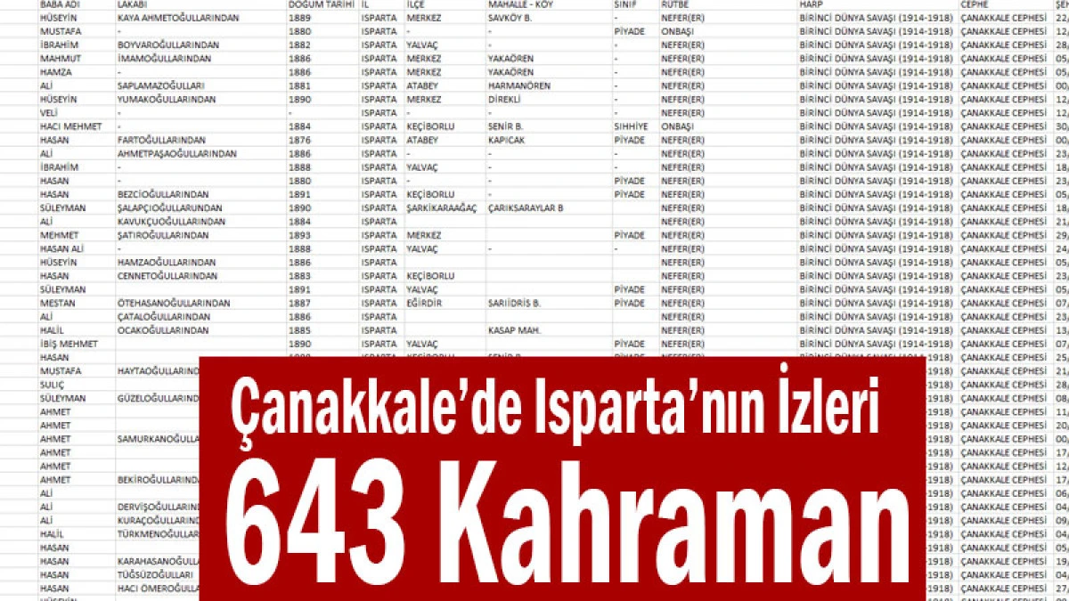 Öte yandan verilerde Isparta’nın büyük kaybı dikkat çekti. Çanakkale’de şehit düşen askerler arasında 643 Ispartalı yer alıyor. Bu rakam, kentin milli mücadeledeki önemli rolünü ve fedakârlığını bir kez daha ortaya koydu.