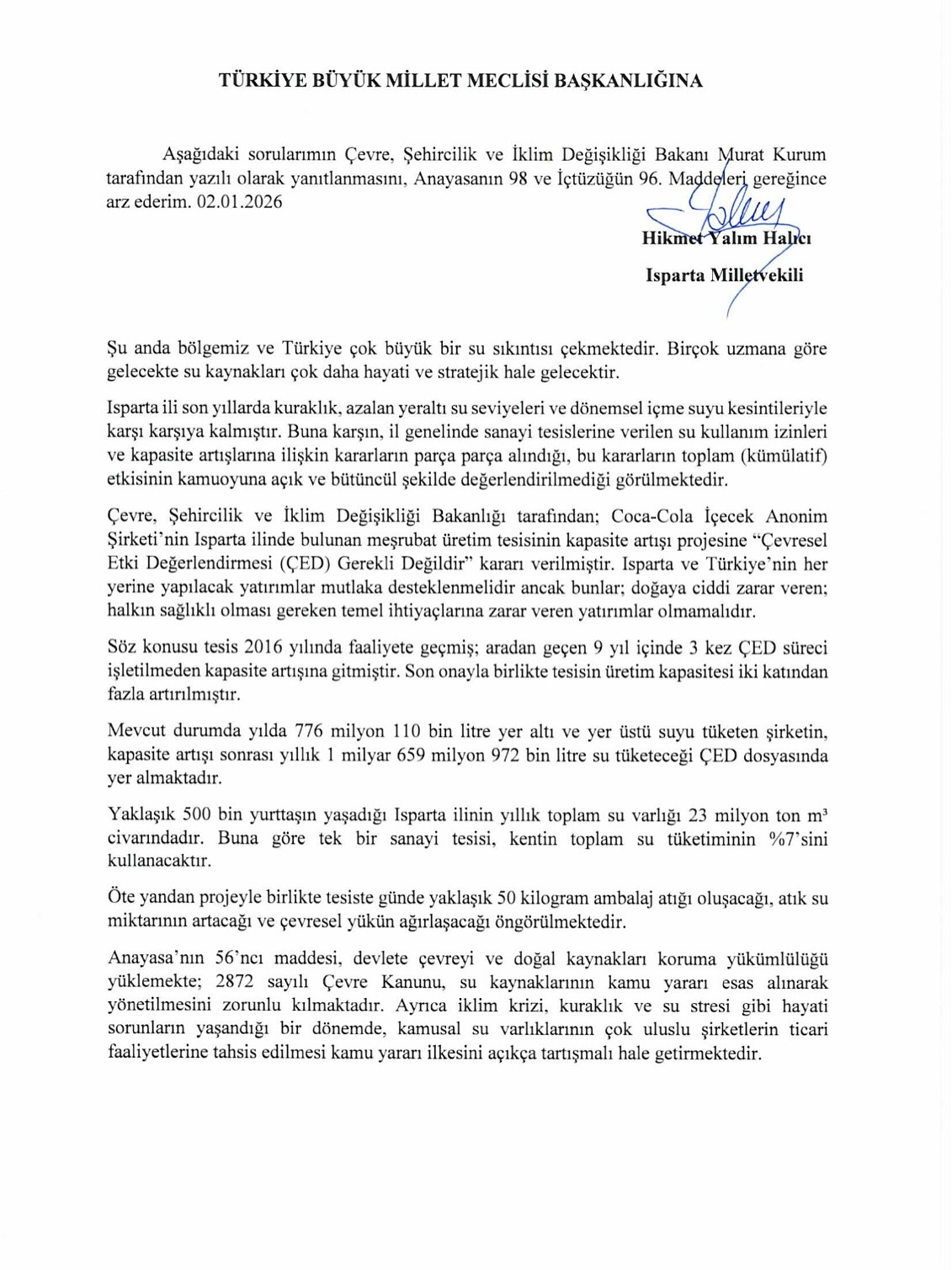 CHP Isparta Milletvekili Hikmet Yalım Halıcı, Isparta’daki Coca-Cola tesisine üçüncü kez “ÇED Gerekli Değildir” kararı verilmesine tepki gösterdi. Halıcı, “Kuraklık varken yurttaşlara tasarruf çağrısı yapılırken, tek bir tesis kentin suyunun %7’sini kullanacak” dedi.