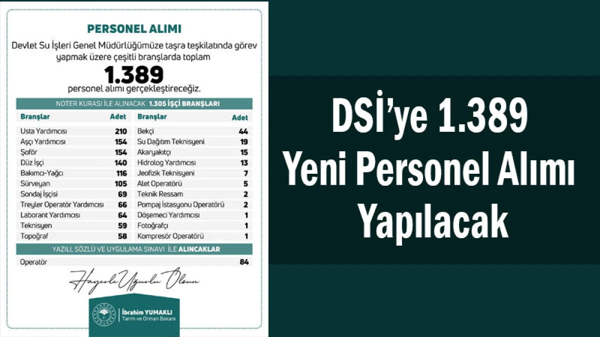 Tarım ve Orman Bakanı İbrahim Yumaklı, Devlet Su İşleri (DSİ) Genel Müdürlüğü taşra teşkilatında görev yapmak üzere 1.389 personel alımı yapılacağını açıkladı.