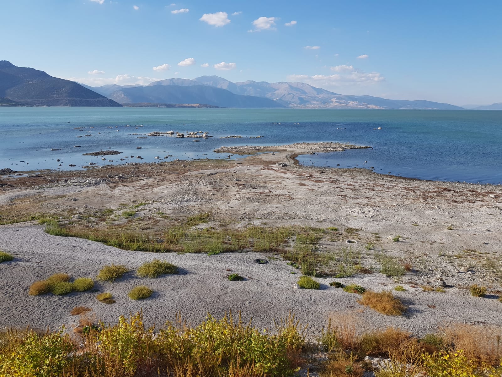 Bölgeden kaydedilen görüntülerde, gölün orta kesimlerinde suyun tamamen çekildiği, yer yer adacıkların oluştuğu görüldü.