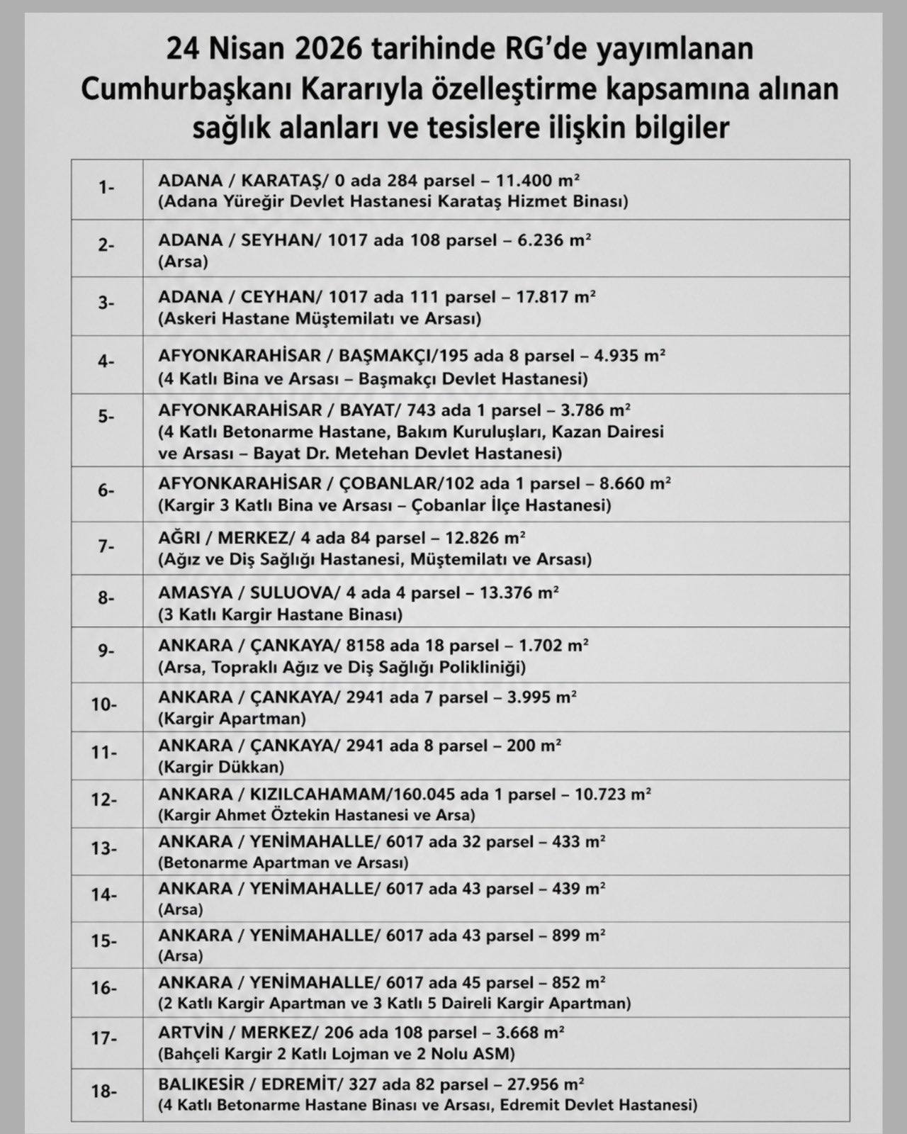 Hüseyin Yıldızhan, 24 Nisan 2026 tarihinde Resmi Gazete’de yayımlanan kararnameye dikkat çekerek, yaklaşık 10 bin metrekarelik alanın satış/özelleştirme kapsamına alındığını ifade etti.