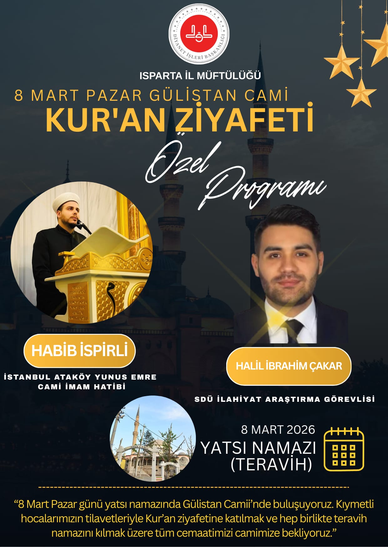 Isparta İl Müftülüğü tarafından Ramazan ayı kapsamında Gülistan Camii’nde “Kur’an Ziyafeti Özel Programı” düzenlenecek.