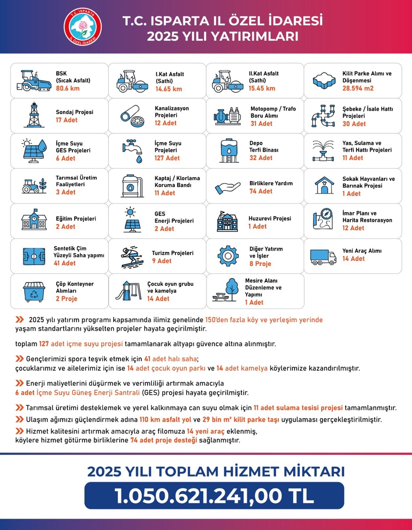 Isparta İl Özel İdaresi, 2025 yılı boyunca il genelinde hayata geçirdiği kapsamlı hizmet ve yatırımlarla dikkat çekti. Köylerden merkeze, altyapıdan spora kadar geniş bir yelpazede yürütülen çalışmalarla 150’den fazla noktada toplam 1 milyar 50 milyon TL’yi aşan yatırım Ispartalıların hizmetine sunuldu.