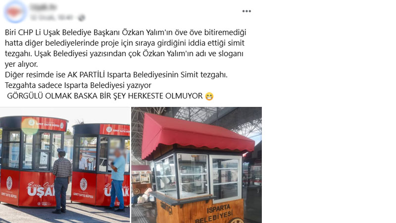 Son günlerde sosyal medyada gündeme gelen simit tezgahları üzerinden belediyeler arasındaki fark dikkat çekiyor. Uşak’ta Belediye Başkanı Özkan Yalım, simit tezgahını öve öve bitiremiyor, hatta diğer belediyelerin de proje için sıraya girdiğini iddia ediyor. Tezgahta, Uşak Belediyesi logosunun yanı sıra Özkan Yalım’ın adı ve sloganları belirgin şekilde yer alıyor.