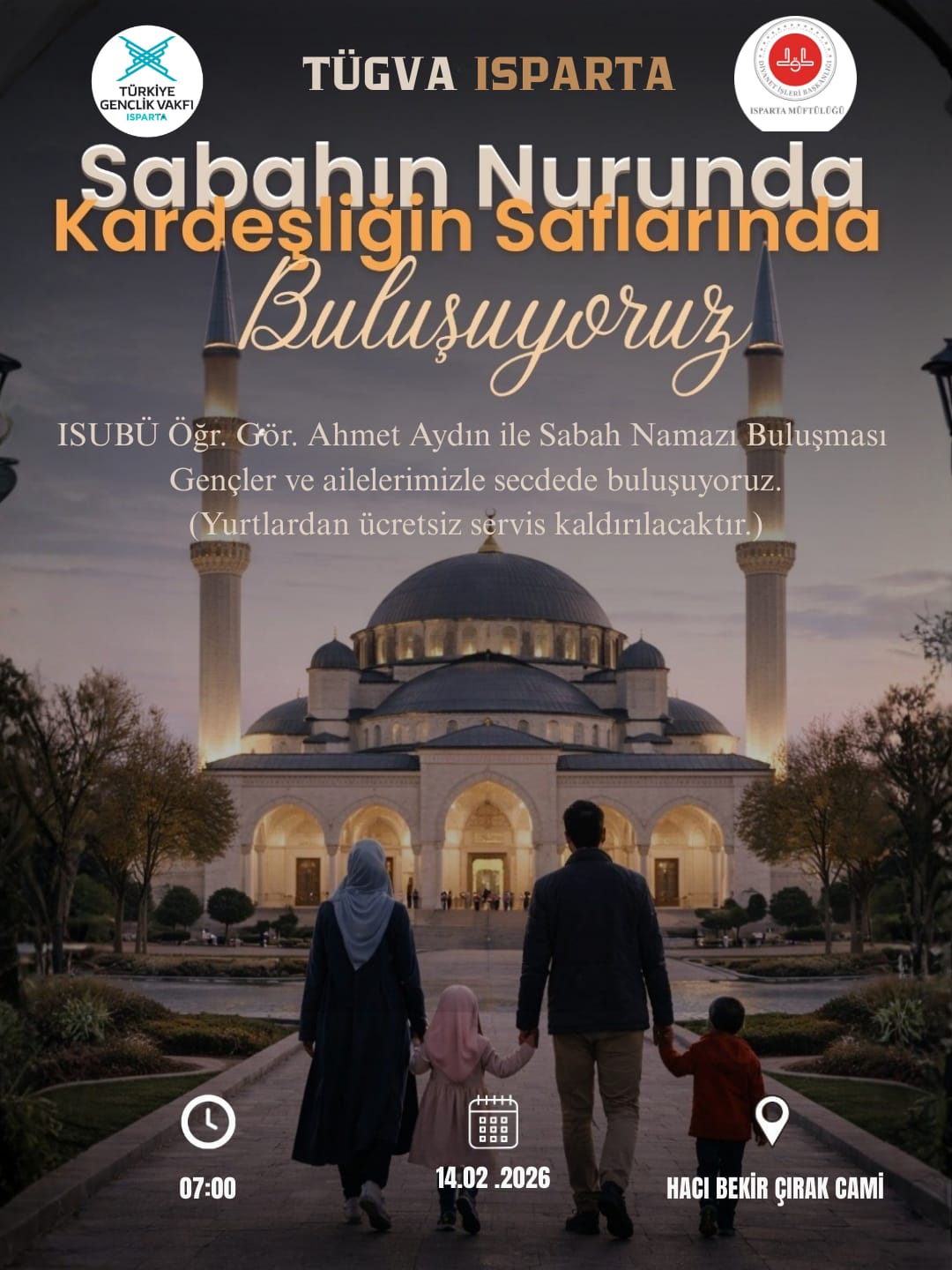 Türkiye Gençlik Vakfı (TÜGVA) Isparta Şubesi tarafından aileler ve gençlere yönelik Sabahın Nurunda Kardeşliğin Saflarında temalı sabah namazı buluşması düzenleniyor.