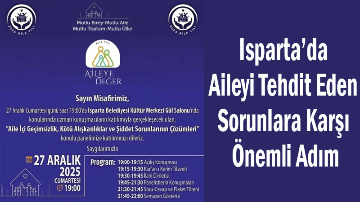 Panel, 27 Aralık 2025 Cumartesi günü saat 19.00’da, Isparta Belediyesi Kültür Merkezi Gül Salonu’nda yapılacak. Alanında uzman konuşmacıların katılımıyla gerçekleştirilecek programda, aile kurumunu tehdit eden sorunlara karşı farkındalık oluşturulması hedefleniyor.