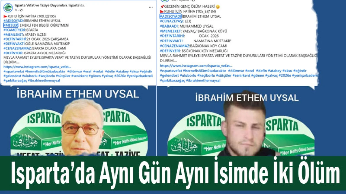 Kentte hem gençler hem de emekli öğretmen camiasında derin üzüntü yaşandı. Genç İbrahim Ethem Uysal, 23 yaşında, Yalvaç Bağkonak Köyü’nde defnedilecek. Emekli Öğretmen İbrahim Ethem Uysal, Fen Bilgisi öğretmeni olarak görev yapmış, Isparta Akyol Mezarlığı’na defnedilecek.