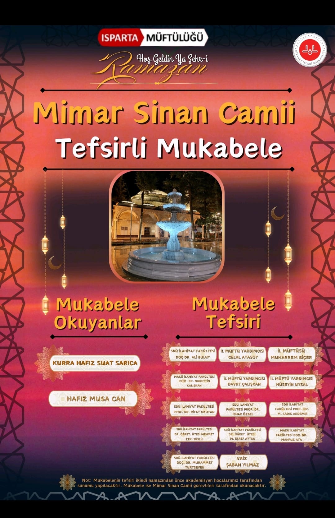 Mukabeleyi Kurra Hafız Suat Sarıca ve Hafız Musa Can okuyacak. Programda ayrıca alanında uzman akademisyenler ve il müftülüğü yetkilileri tarafından tefsir sunumları yapılacak. Bu kapsamda SDÜ İlahiyat Fakültesi öğretim üyeleri ile İl Müftüsü ve yardımcısı gibi önemli isimler tefsir derslerini katılımcılarla paylaşacak.