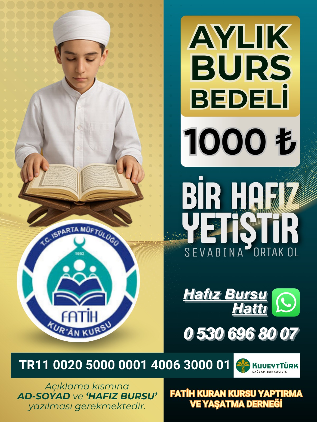Isparta İl Müftülüğü Fatih Kur’an Kursu, hafızlık eğitimi görmek isteyen öğrenciler için anlamlı bir destek projesini hayata geçiriyor. “Bir Hafız Yetiştir” sloganıyla başlatılan kampanya kapsamında öğrencilere aylık 1.000 TL burs imkânı sunuluyor.