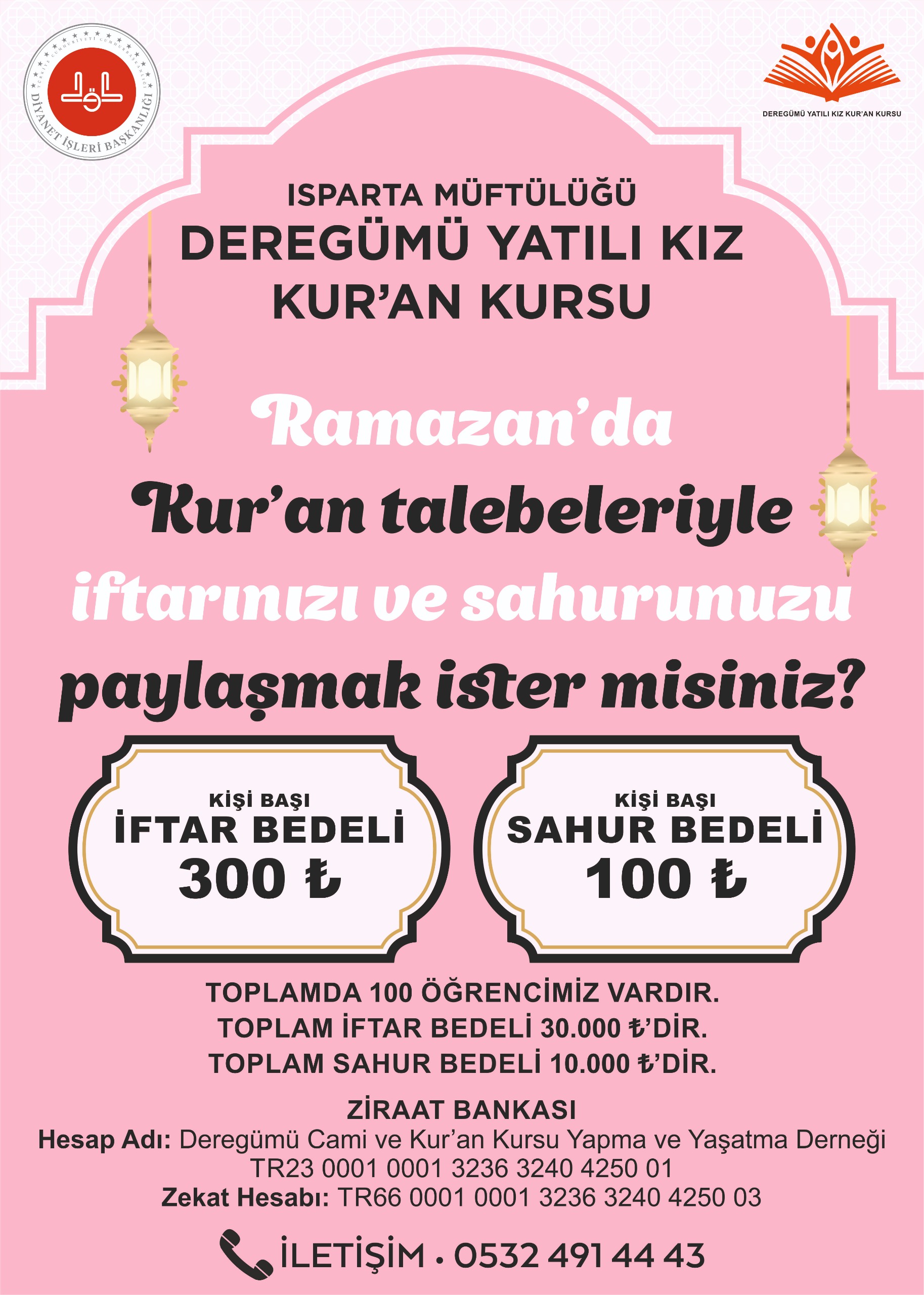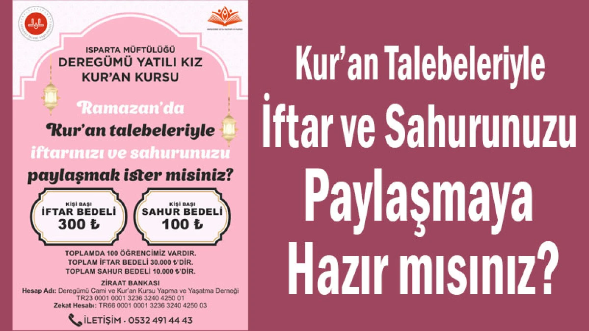 Kurs yönetimi, Ramazan’ın paylaşma ve yardımlaşma ruhunu vurgulayarak, hayırseverleri iftar ve sahur sofralarını öğrencilerle birlikte paylaşmaya davet etti. Bu özel anlar, sadece bir öğün değil, gönülleri birleştiren ve kardeşlik duygusunu güçlendiren manevi bir bağ oluşturacak. Dernek yönetiminden yapılan açıklamada, "Muhterem kardeşlerim, güller ve göller diyarı Isparta'mızın İl Müftülüğüne bağlı ilk yatılı kız Kur'an kursu olan Deregümü Yatılı Kız Kur'an Kursu 1994 yılında faaliyete geçmiş olup, günümüze kadar 3.000 öğrencimizin Kur'an-ı Kerim ve Temel Dini Bilgiler eğitimine, 500 öğrencimizin de Hafız olmalarına vesile olmuştur.