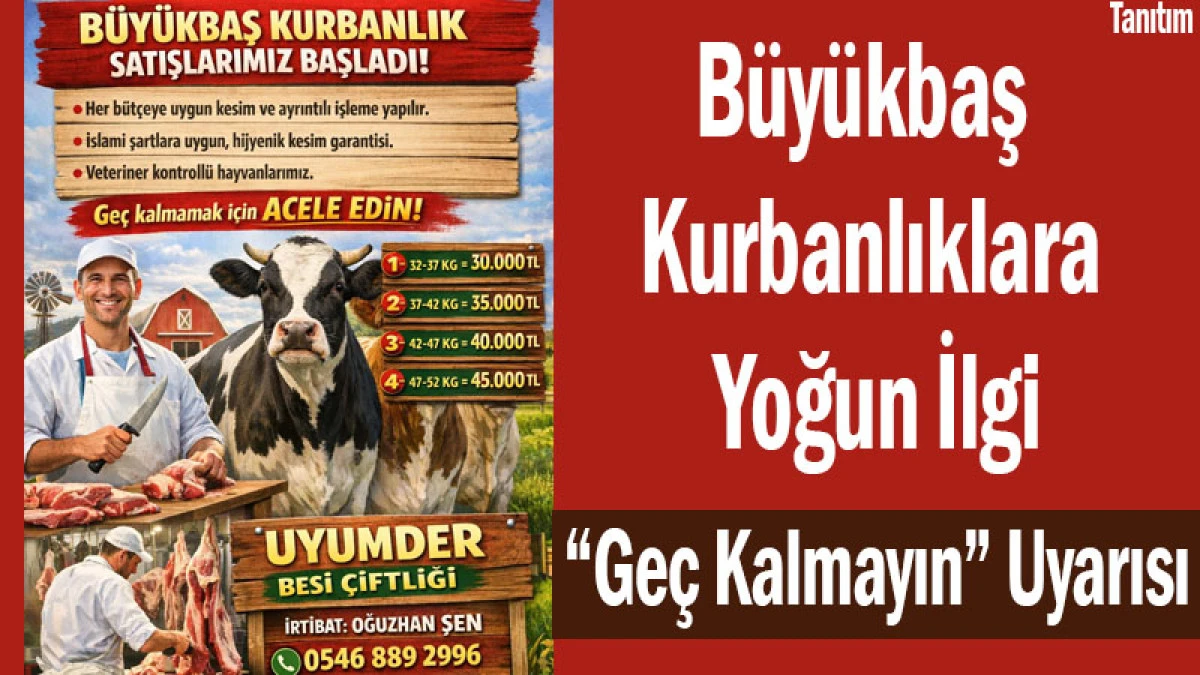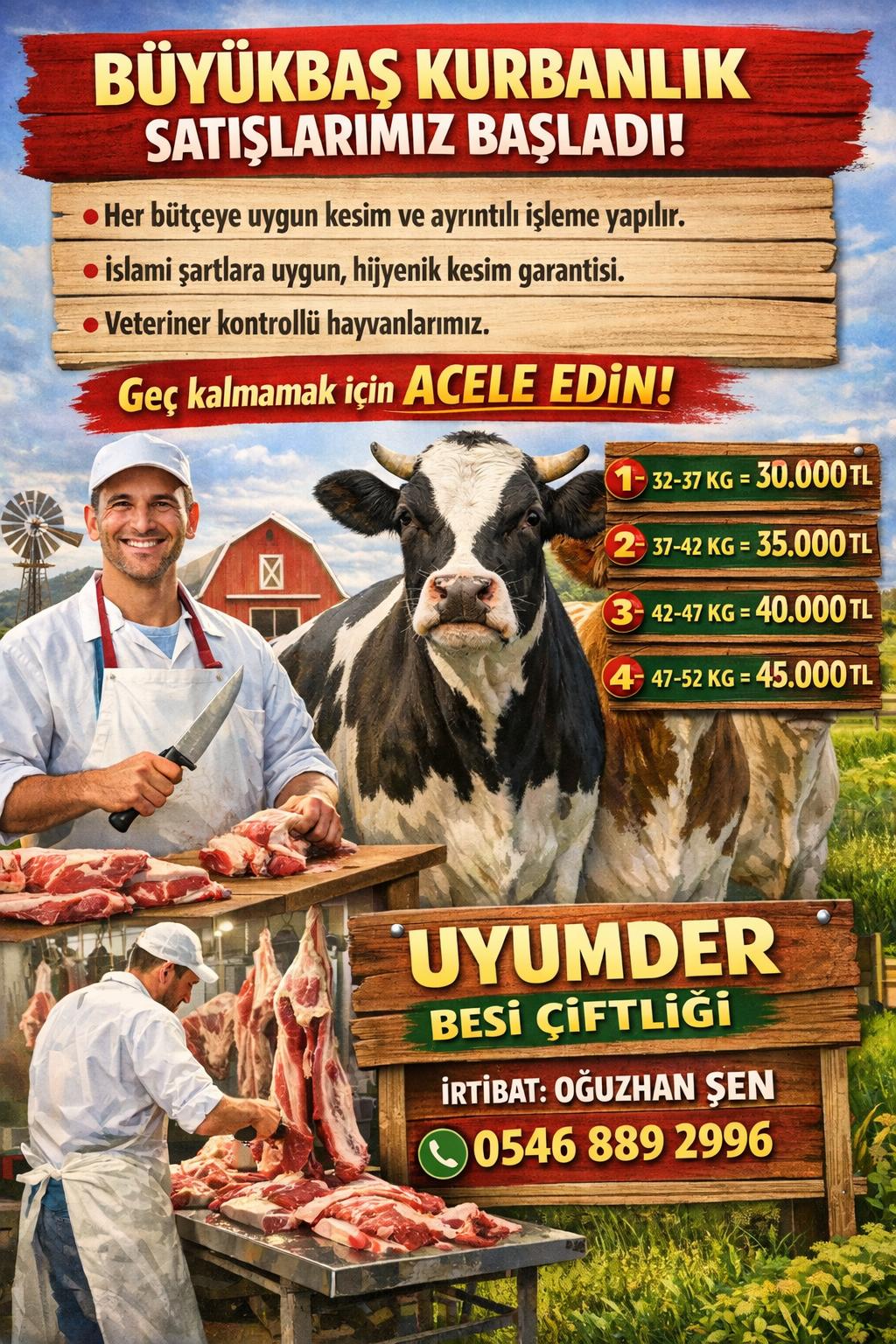 Uyumder Besi Çiftliği tarafından yapılan duyuruda, her bütçeye uygun kurbanlık seçeneklerinin sunulduğu belirtilirken, kesim ve et işleme hizmetlerinin de sağlandığı ifade edildi. Açıklamada, kesimlerin İslami şartlara uygun ve hijyenik ortamda gerçekleştirildiği, tüm hayvanların ise veteriner kontrolünden geçtiği vurgulandı.