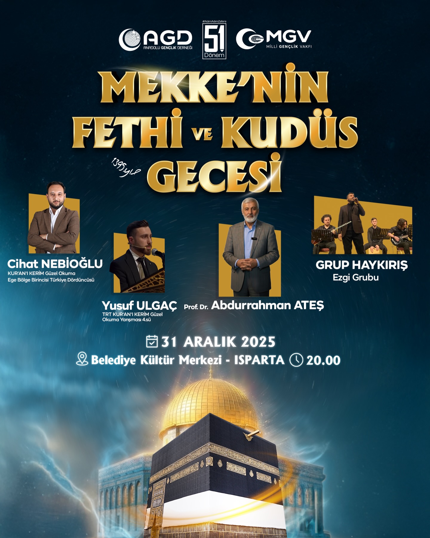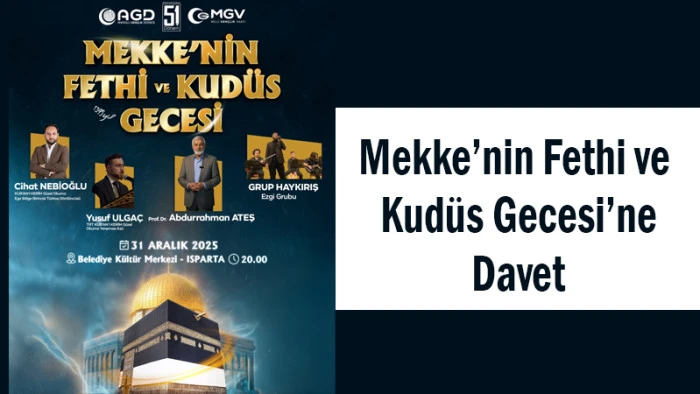 Anadolu Gençlik Derneği (AGD) Isparta Şubesi tarafından, Mekke’nin Fethi’nin yıl dönümü dolayısıyla anlamlı bir program düzenleniyor. “Kalk Uyar, Fethi Müjdele!” sloganıyla gerçekleştirilecek Mekke’nin Fethi ve Kudüs Gecesi, 31 Aralık 2025 Çarşamba günü Isparta’da yapılacak.