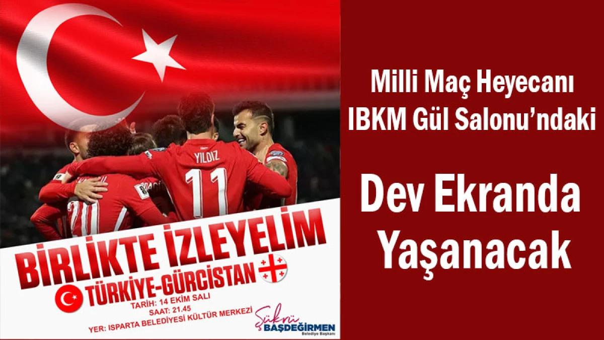 A Milli Futbol Takımımız Dünya Kupası Elememeleri Grup Maçında 14 Ekim Salı günü saat 21.45’de Gürcistan ile karşılaşacak. Isparta Belediyesi, Dünya Kupası yolundaki Milli Takımımızın bu önemli maçını Isparta Belediyesi Kültür Merkezi Gül Salonu’n da dev ekrandan yayınlayacak.