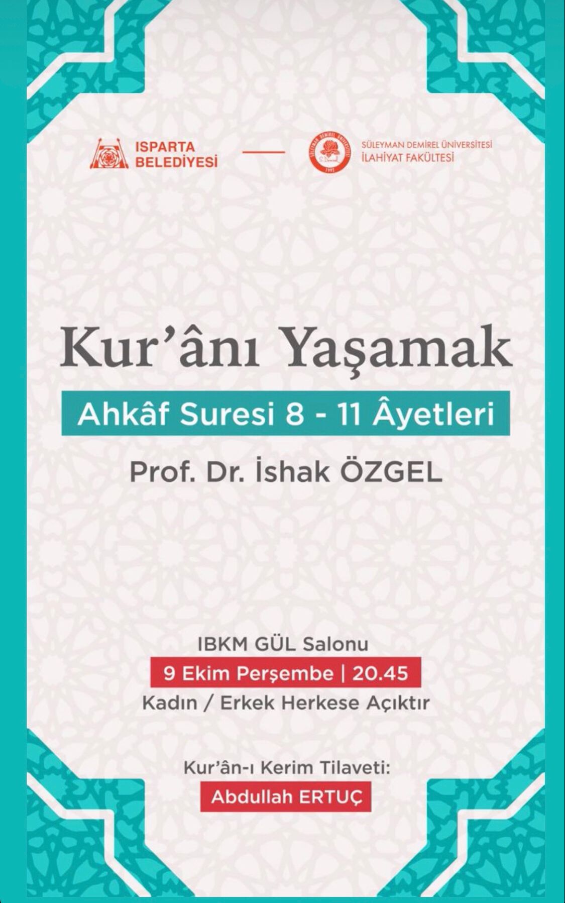 Programda Kur’an-ı Kerim tilaveti, Abdullah Ertuç tarafından yapılacak. Prof. Dr. Özgel, Ahkâf Suresi 8-11. ayetler üzerinden Kur’an’ın hayatımızdaki yolculuğunu ve günlük yaşama nasıl rehberlik edebileceğini aktaracak.
