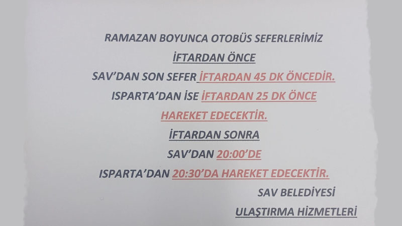 Sav Belediyesi Ulaştırma Hizmetleri, Ramazan ayı boyunca Isparta ile Sav arasında gerçekleştirilen otobüs sefer saatlerinde değişikliğe gitti.
