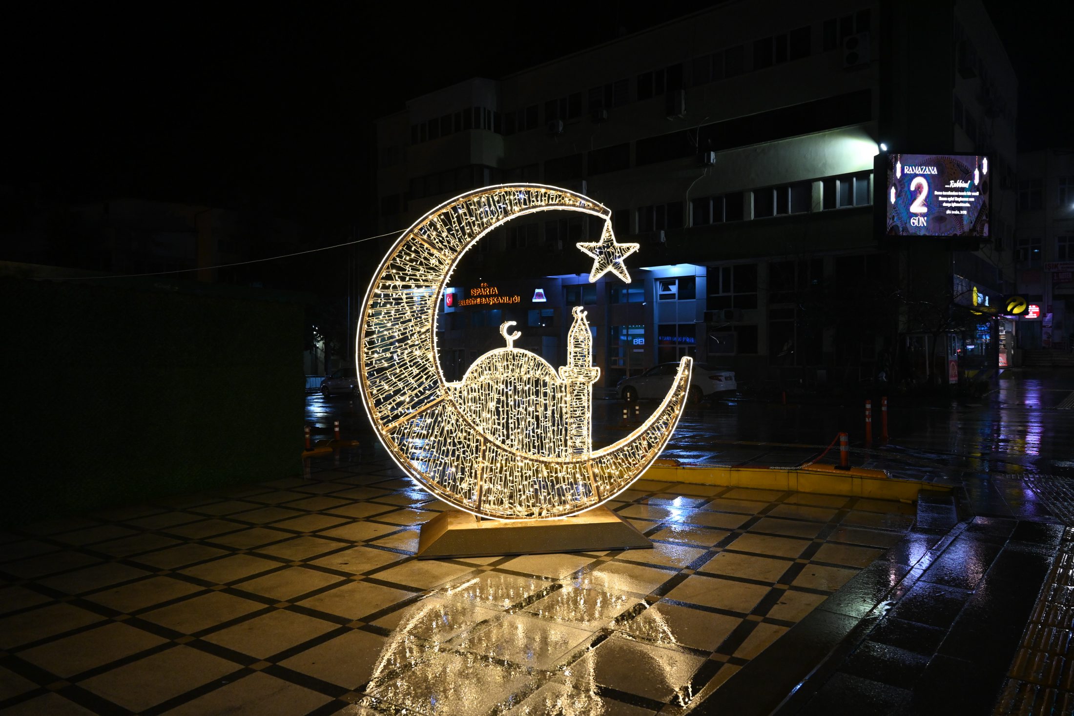 Belediye hizmet binasının yan tarafındaki kaldırıma ışıklı kandil yerleştirilirken, bina önündeki otoparkın üst kısmına hilal ve cami silüetleri konularak ışıklandırıldı. Eski çarşı polis karakolunun karşısındaki noktaya ise “Hayırlı Ramazanlar” yazılı mahya ile cami silueti yerleştirildi.