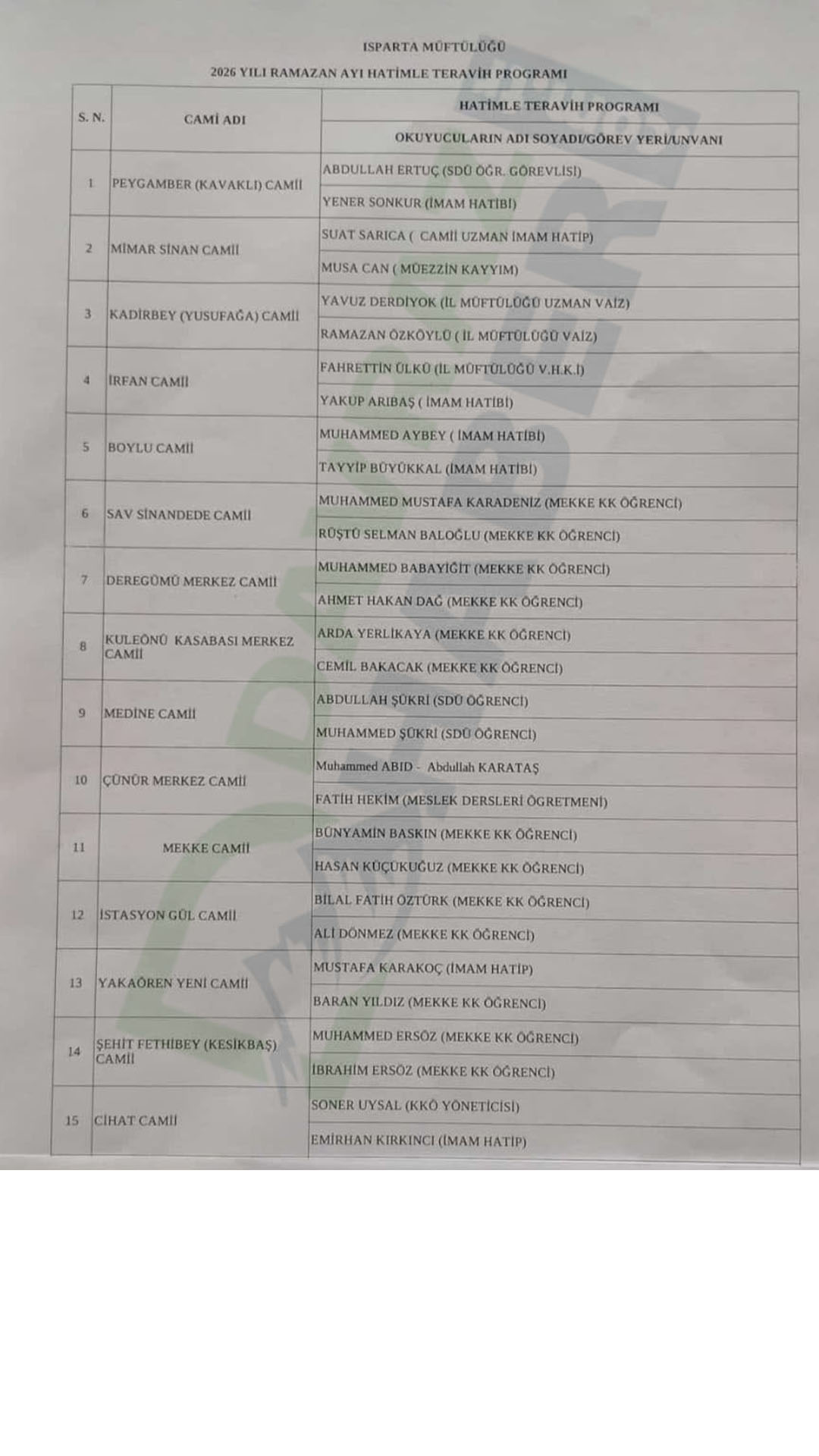 Isparta Müftülüğü, 2026 yılı Ramazan ayı kapsamında hatimle teravih namazı kılınacak camiler ile bu camilerde görev alacak din görevlilerini açıkladı.