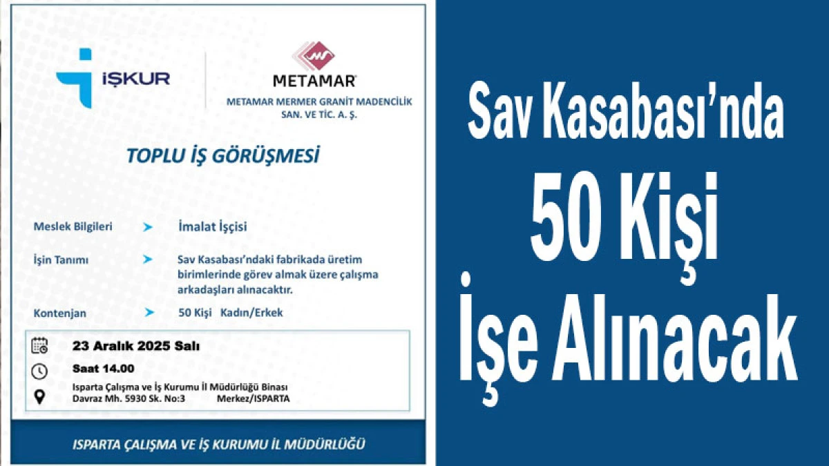 Isparta Çalışma ve İş Kurumu İl Müdürlüğü ile Metamar Mermer Granit Madencilik A.Ş., 50 kişilik işçi alımı için toplu iş görüşmesi düzenliyor.