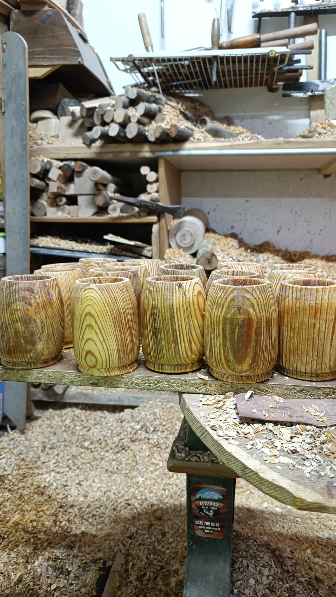 Seçilen doğal çıralı ağacı torna tezgâhında ustalıkla şekillendiren Ruhi Usta, önce bardağın dış formunu oluşturuyor, ardından ince işçilikle iç kısmı oyuyor. Son aşamada yapılan doğal cila çalışmasıyla bardak hem hijyenik hem de dayanıklı hale geliyor.