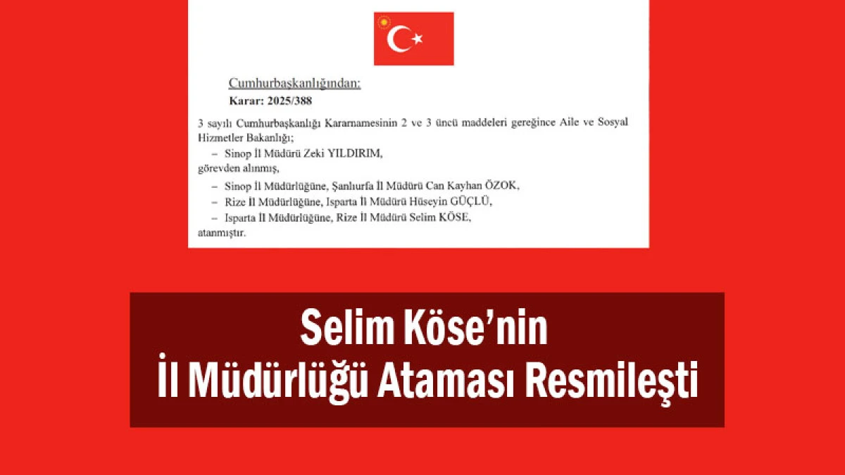 Karara göre, Rize Aile ve Sosyal Hizmetler İl Müdürü Selim Köse, Isparta İl Müdürü olarak asaleten atandı.