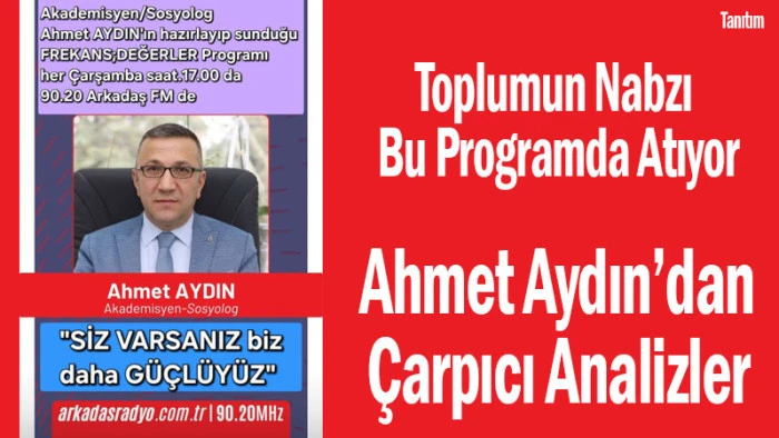 Ahmet Aydın’ın hazırlayıp sunduğu “Frekans; Değerler” programı, Isparta’da radyo dinleyicileriyle buluşmaya devam ediyor. Toplumsal değerler, kültürel yapı ve güncel sosyal konuların ele alındığı program, her Çarşamba saat 17.00’de Arkadaş FM’de yayınlanıyor.