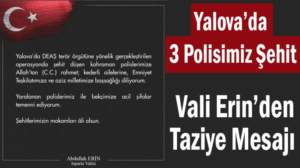 Vali Erin mesajında şu ifadelere yer verdi: "Yalova’da DEAŞ terör örgütüne yönelik gerçekleştirilen operasyonda şehit düşen kahraman polislerimize Allah’tan (C.C.) rahmet; kederli ailelerine, Emniyet Teşkilatımıza ve aziz milletimize başsağlığı diliyorum. Yaralanan polislerimiz ile bekçimize acil şifalar temenni ediyorum. Şehitlerimizin makamları âli olsun.”